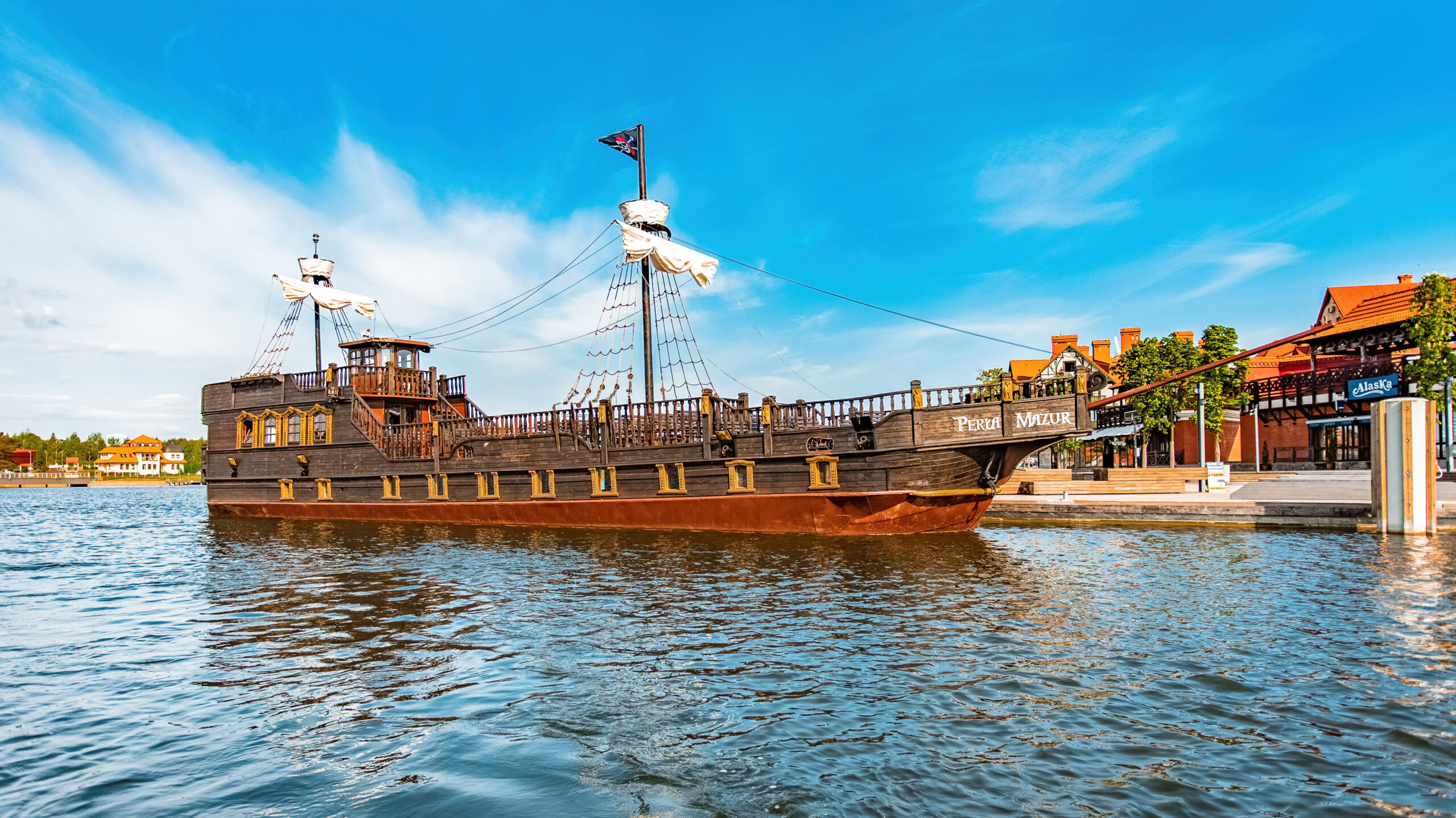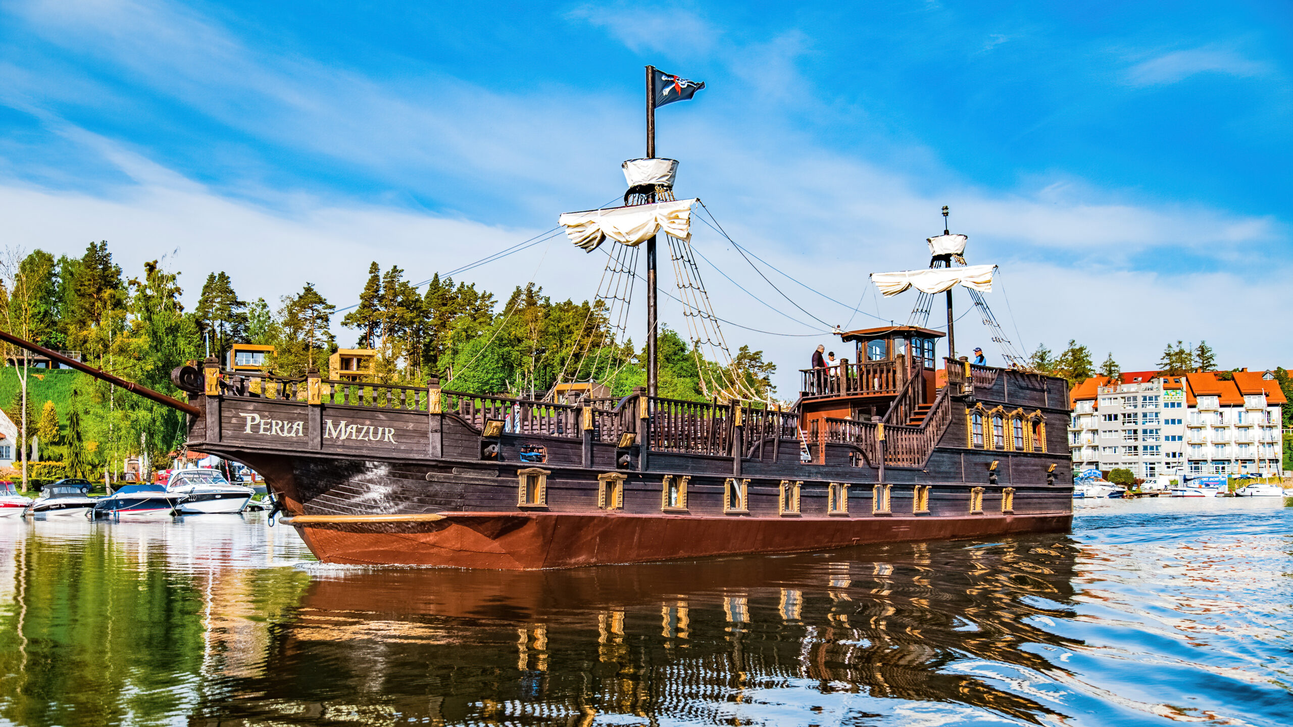 Perła Mazur to unikalny statek pasażerski na Mazurach, który przenosi pasażerów w piracki klimat. Na pokładzie znajduje się bocianie gniazdo, piracka bandera oraz szkielet, pozostałość po dawnym korsarzu, który chętnie pozuje do zdjęć. Całość uzupełnia odpowiednia muzyka oraz komentarz lektora, opowiadającego o historii i położeniu regionu.